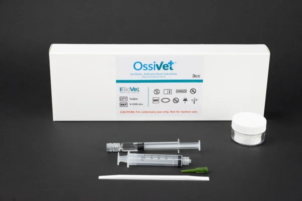 OssiVetâ„¢ is a biomimetic, self-setting CalciummPhosphate-based bioadhesive bone substitute enhanced with phosphoserine. The unique components ensure OssiVetâ„¢ provides adhesive and cohesive properties. Designed for veterinary orthopedic use, OssiVetâ„¢ is indicated for reduction, provisional fixation, or void filling of bone fractures or defects in order to enhance structural stability where standard fixation alone cannot provide sufficient support for functional mobilisation.